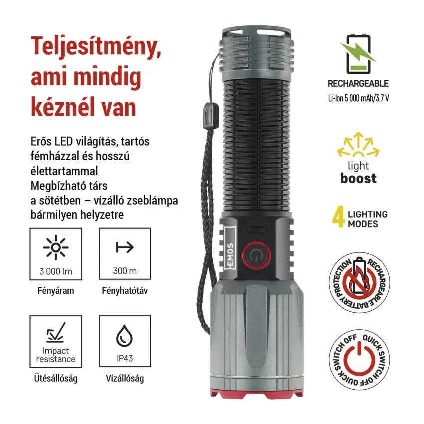 üzemidő részletezés LED BOOST – 1 min, LED 100 % – 3,5 óra, LED 50 % – 7 óra, LED 20 % – 15 óra