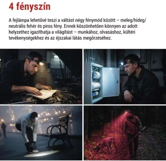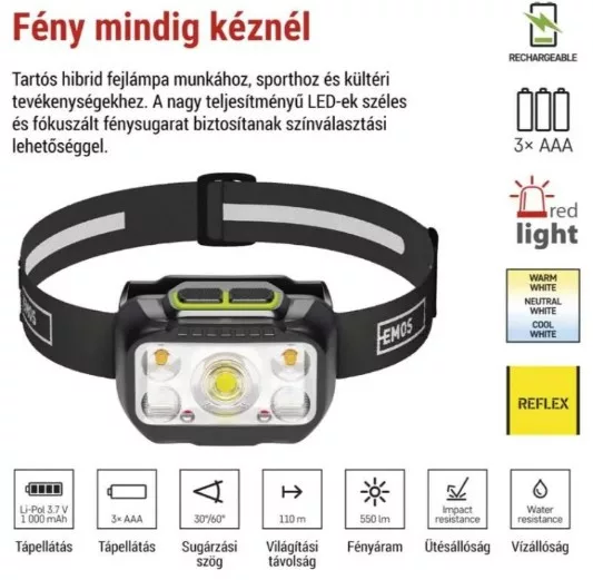 üzemidő részletezés LED CW 100 % – 3,5 h, LED CW 50 % – 4 h, LED CW 20 % – 8 h, LED WW – 9 h, LED NW – 7,5 h