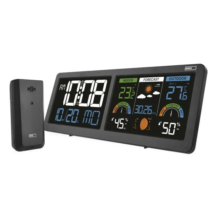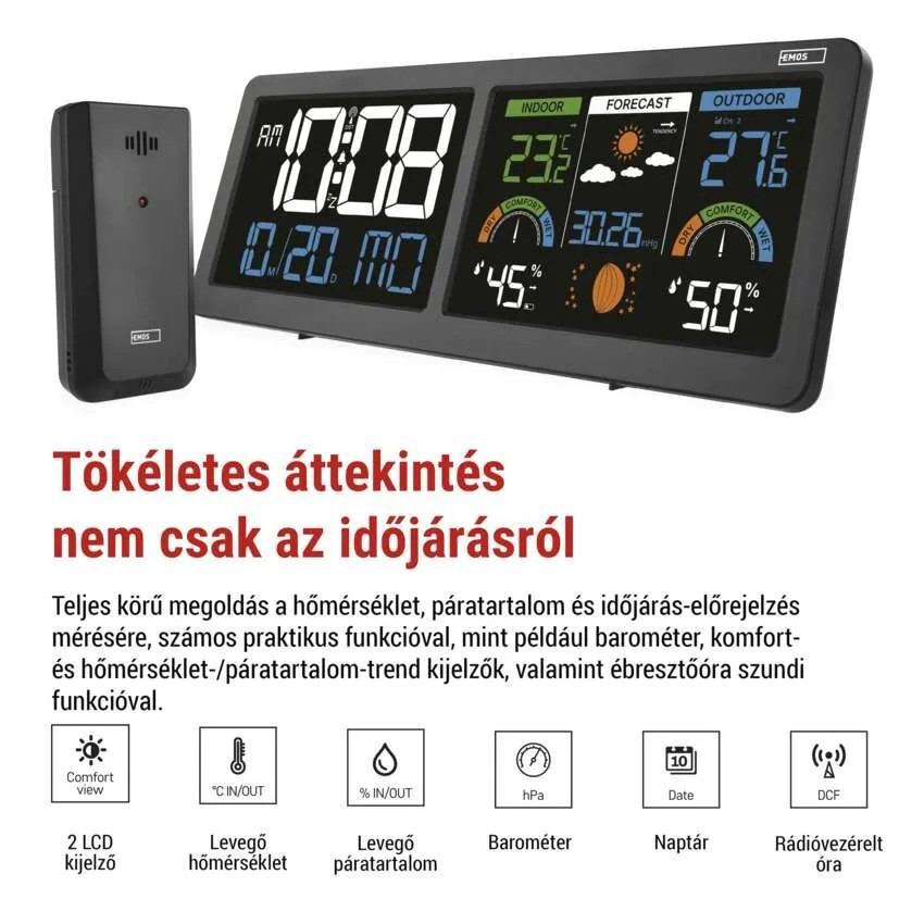 Bemutatjuk az új, modern meteorológiai állomást, amely a mindennapi időjárás-figyelést áttekinthető és elegáns élménnyé varázsolja. A belső és külső hőmérséklet és páratartalom mérésének köszönhetően mindig tökéletes áttekintést kap a környező éghajlatról. Az áttekinthető időjárás-előrejelzés és a 12 holdfázis részletes megjelenítése szélesebb kontextust biztosít minden nap tervezéséhez. Az állomás két háttérvilágítású LCD kijelzővel rendelkezik, amelyek Comfort View funkciója biztosítja az adatok könnyű leolvashatóságát nappal és éjszaka egyaránt. A beépített óra DCF jel vezérlésével gondoskodik az idő pontosságáról. Természetesen rendelkezik ébresztővel Snooze funkcióval, barométerrel, komfortjelzővel, hőmérsékleti trendjelzővel, minimális és maximális értékek rögzítésével, beállítható hőmérsékleti határértékekkel, valamint dátummal, idővel és naptárral – mindez egy helyen, áttekinthetően.