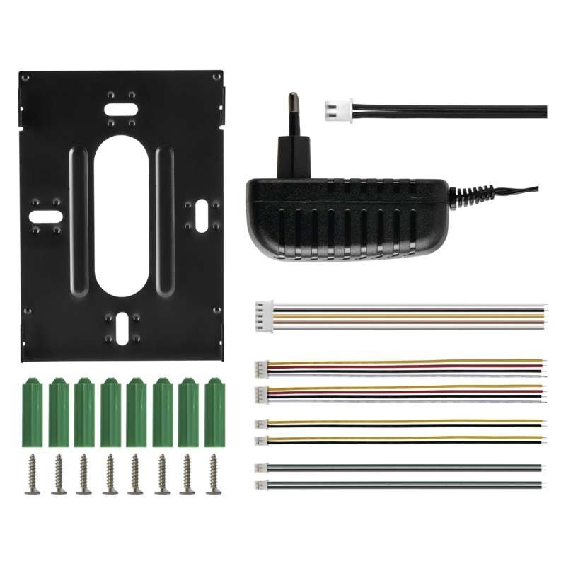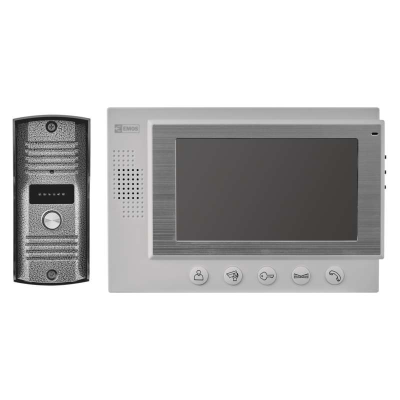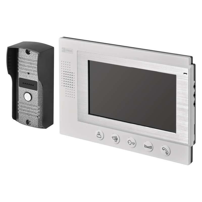 Egyszerű videótelefon-rendszer ajtóhoz. A kép nagy, 7#-es, színes LCD kijelzőn jelenik meg. Az eszköz áramellátásáról 12 V-os adapter gondoskodik. Az eszköz segítségével vezérelhető egy ajtózár és egy csúszókapu.