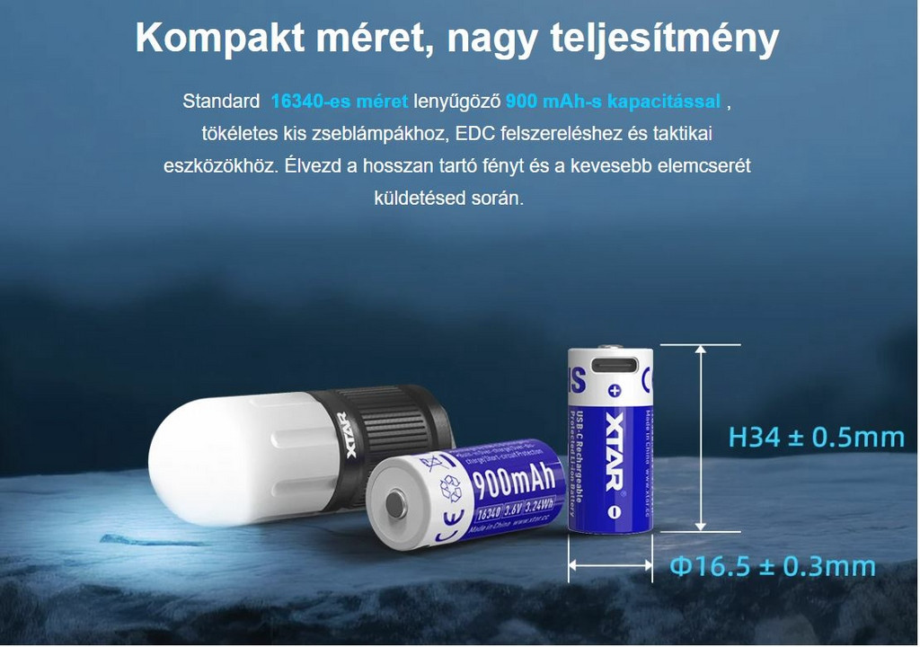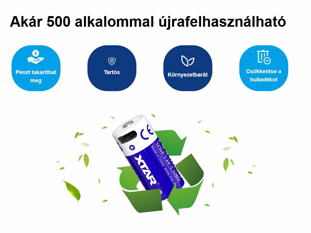 Xtar 16340 900mAh kapacitású Li-Ion akkumulátor,beépített USB-C porttal,védelmi elektronikával, 3,6V feszültséggel