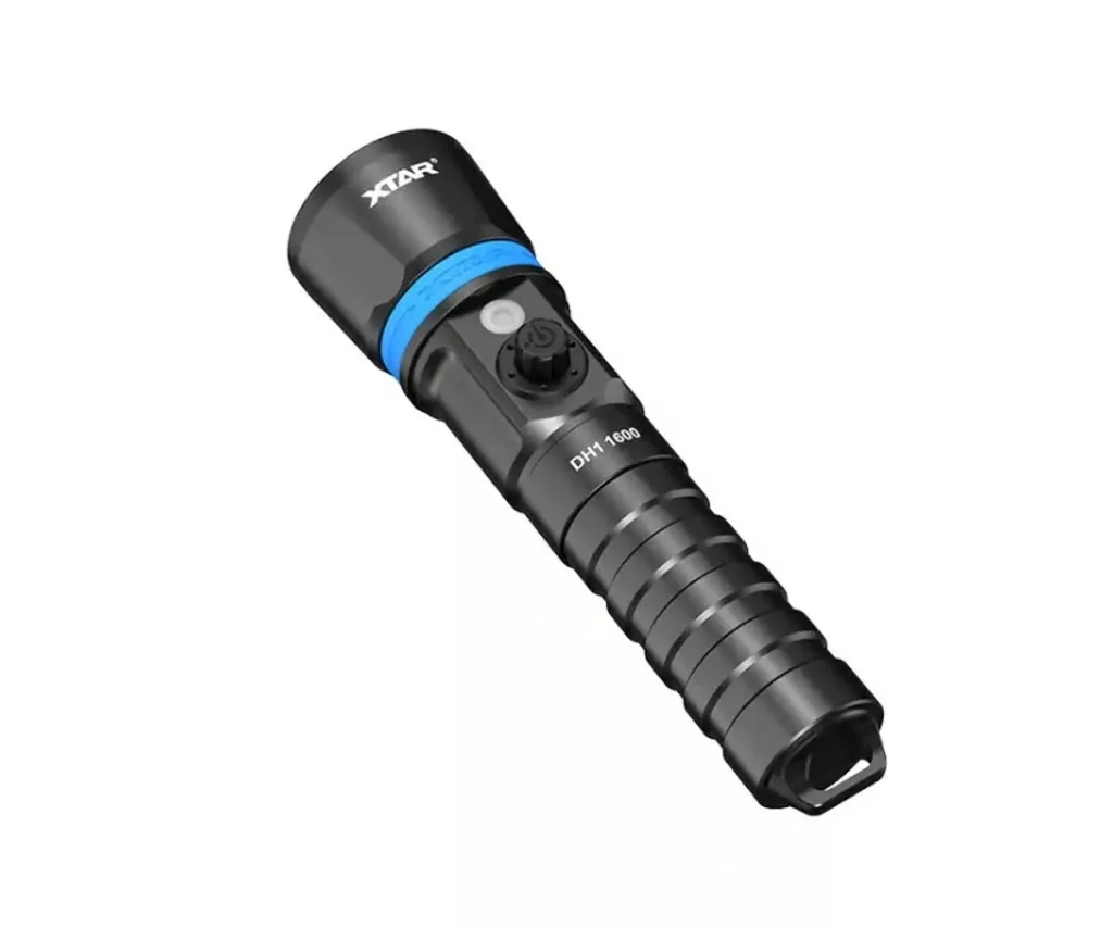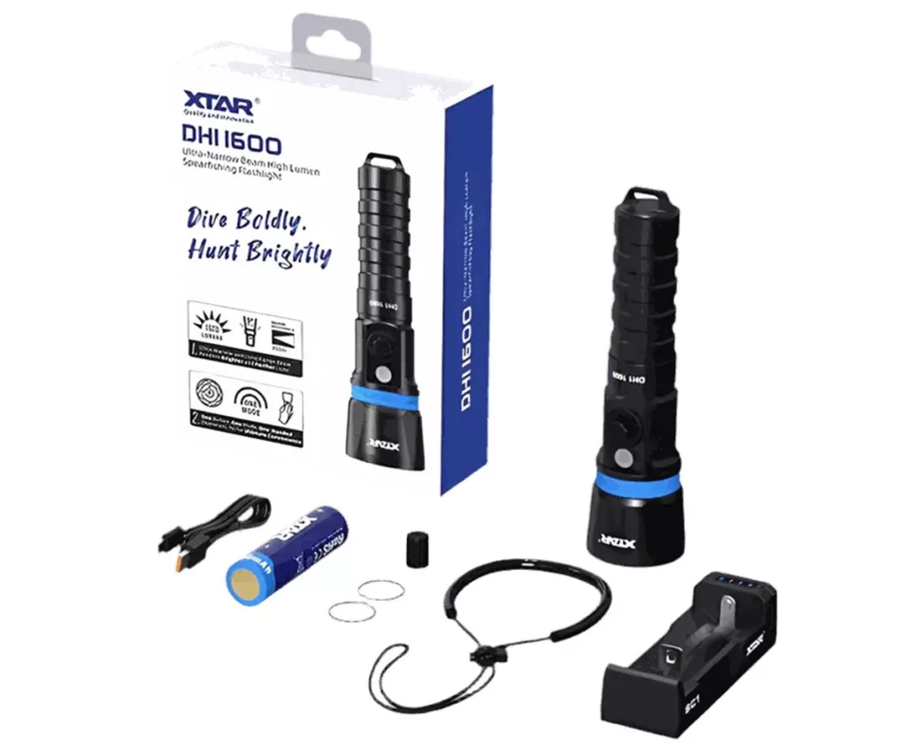 Az XTAR DH1 1600 Hunter professzionális búvárlámpa a legújabb, legmagasabb osztályú Luminus SST-40 diódát használja, amelynek fényereje akár 1600 lumen is lehet. A dióda hideg fehér fényt bocsát ki. Kiváló tömítőképessége akár 100 méteres merülési mélységet is biztosít . Kompatibilis a 21700 méretű Li-ion akkukkal. A test felületeloxált alumíniumból készült , perforált felülettel, strapabíró anódos bevonattal és recézett kialakítással rendelkezik, amely jó és biztonságos fogást biztosít. A jó elektromos érintkezés biztosítása érdekében az elemérintkezők antioxidáns anyagokból készültek, és emellett aranyozottak. A fordított polaritás elleni védelem, a stabilizáló fényteljesítmény-szabályozás, a gurulásgátló, a csukló pántos rögzítés és a mágneses taktikai kapcsoló kiemeli a gyártó professzionális hozzáállását a termékekhez. A 4900 mAh-s Li-ION 21700 akkumulátorral működő lámpa a legmagasabb módban – 1600 lumen – 2,5 órás üzemidőt ér el. A zseblámpához tartozik egy SC1 töltő, egy 21700-as Li-ION akkumulátor PCM-mel, egy USB-C csatlakozókábel, egy csukló pánt és tartalék O-gyűrűk. LED-es akkumulátortöltés-jelzővel is rendelkezik.