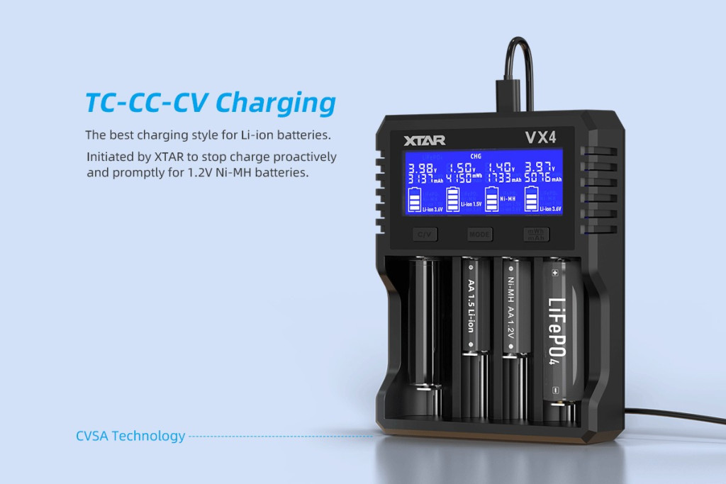 Az Xtar VX4 univerzális töltő szinte minden ismert akkumulátortípussal kompatibilis, pl: 3,6V/3,7V/1,5V Li-Ion, 1,2V Ni-Mh, 3,2V LiFePO4.
