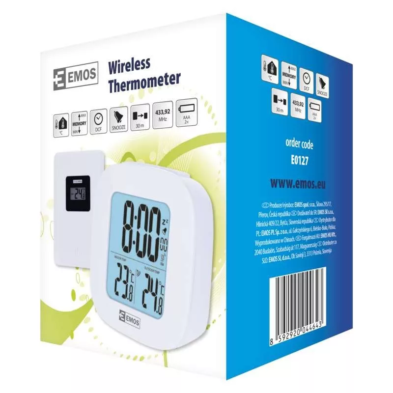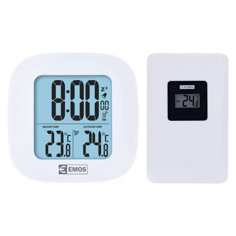 Vezeték nélküli hőmérő a beltéri és kültéri hőmérséklet kijelzésével. A hőmérő 30 m hatótávolságú vezeték nélküli érzékelővel rendelkezik.