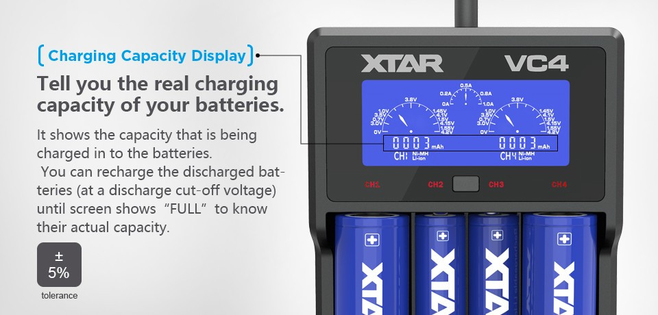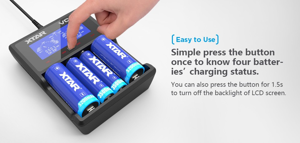 Xtar VC4 négy csatornás Li-Ion,Ni-Mh,Ni-Cd akkumulátor töltő, LCD kijelzővel.