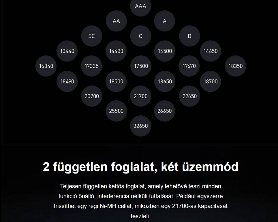 ~Széleskörű kompatibilitás: Támogatja az 1,5 V-os Li-ion, 3,6/3,7 V-os Li-ion, 3,2 V-os LifePO4, 1,2 V-os Ni-MH és más típusú akkumulátorokat.