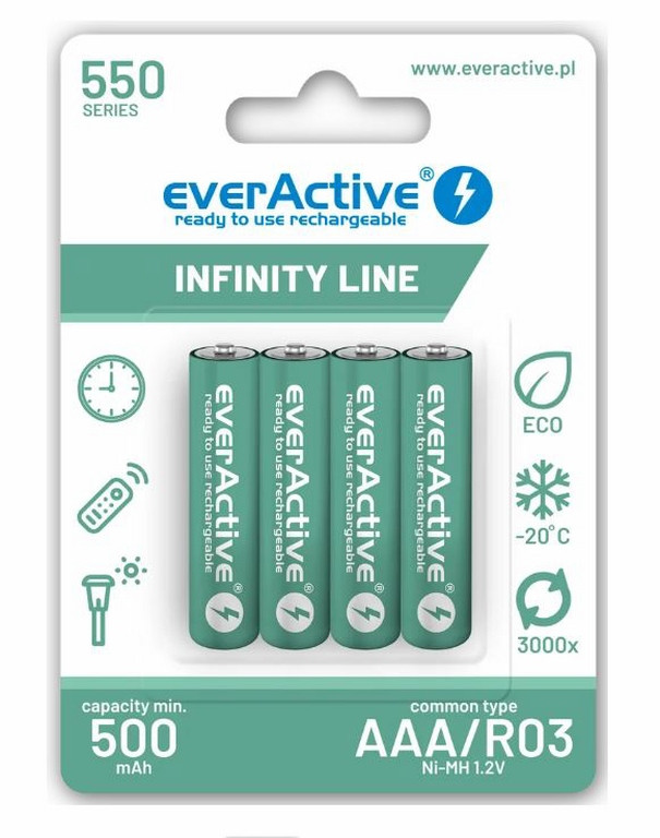 4db innovatív R03 AAA 500 mAh everActive újratölthető akkumulátor "használatra kész" technológiával.